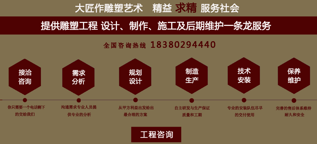 成都大匠作雕塑有限公司,是經成都工商局審定注冊的正規(guī)專業雕塑制作及工程安裝服務機構,是由一群年輕富有朝氣的年輕人創(chuàng)辦,發(fā)軔于四川省成都市龍泉驛區。它是一家******于創(chuàng)作、制作和銷售為一體的公司。大匠作擁有多年從事公共藝術的專業人員和雕塑制作人組成的核心團隊,為您提供專業、具創(chuàng)新的設計及制作服務。公司成立以來,秉承“******服務、誠信為本”的宗旨,以客戶需求為目標導向,不斷學習,進取,優(yōu)化和提高服務質量,公司向您******——“您的滿意***是我們的信譽”,我們將以飽滿的熱情和******的服務贏得您的贊譽和支持。 愛心,細心,耐心,責任心是我們的要求,盡心盡職,為您打造出創(chuàng)新、專業、******的設計方案,我們堅信先做人、后做事,用心對待客戶,實行透明收費,人性化服務,本著對客戶負責,對客戶負責,更是對自己發(fā)展負責的態(tài)度,爭取做到讓每位客戶滿意